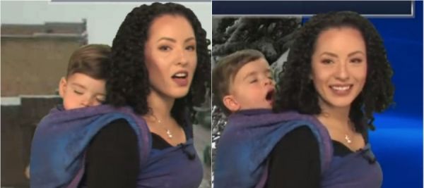 مذيعة تقدم نشرة بينما يتثاءب رضيعها وينام فوق ظهرها (فيديو)