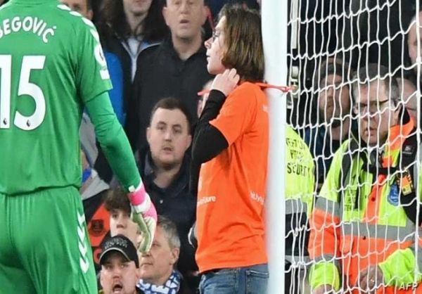 مشجع يربط نفسه بقائم المرمى خلال مباراة ايفرتون ونيوكاسل (فيديو)