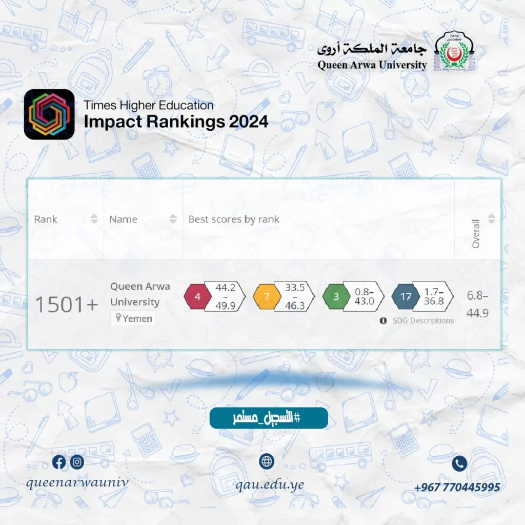 جامعة الملكة اروى تحقق انجازاً تاريخياً كاول جامعة يمنية تدخل تصنيف مجلة التايمز للتعليم العالي “تاثير الجامعات” لعام 2024