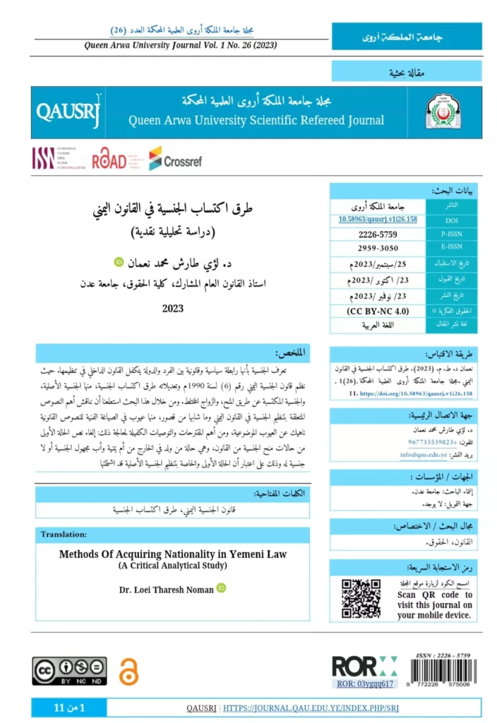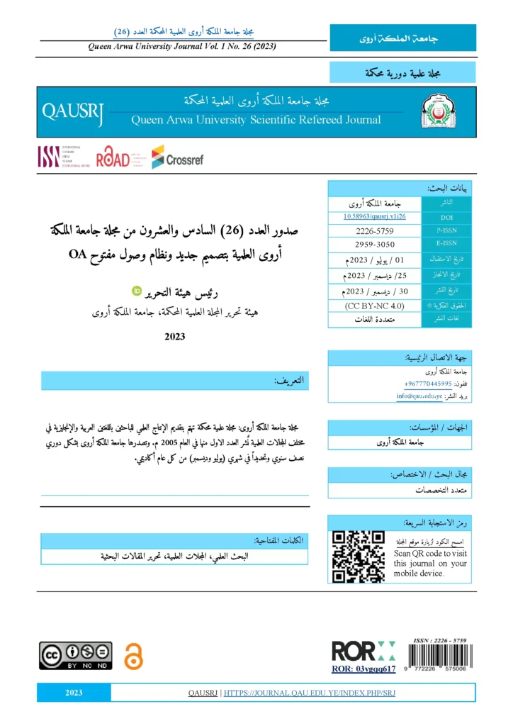 جامعة الملكة اروى تُصدر العدد (26) من مجلتها العلمية بتصميم جديد ونظام وصول مفتوح OA وتفتح باب تقديم المقالات البحثية للعدد (27)