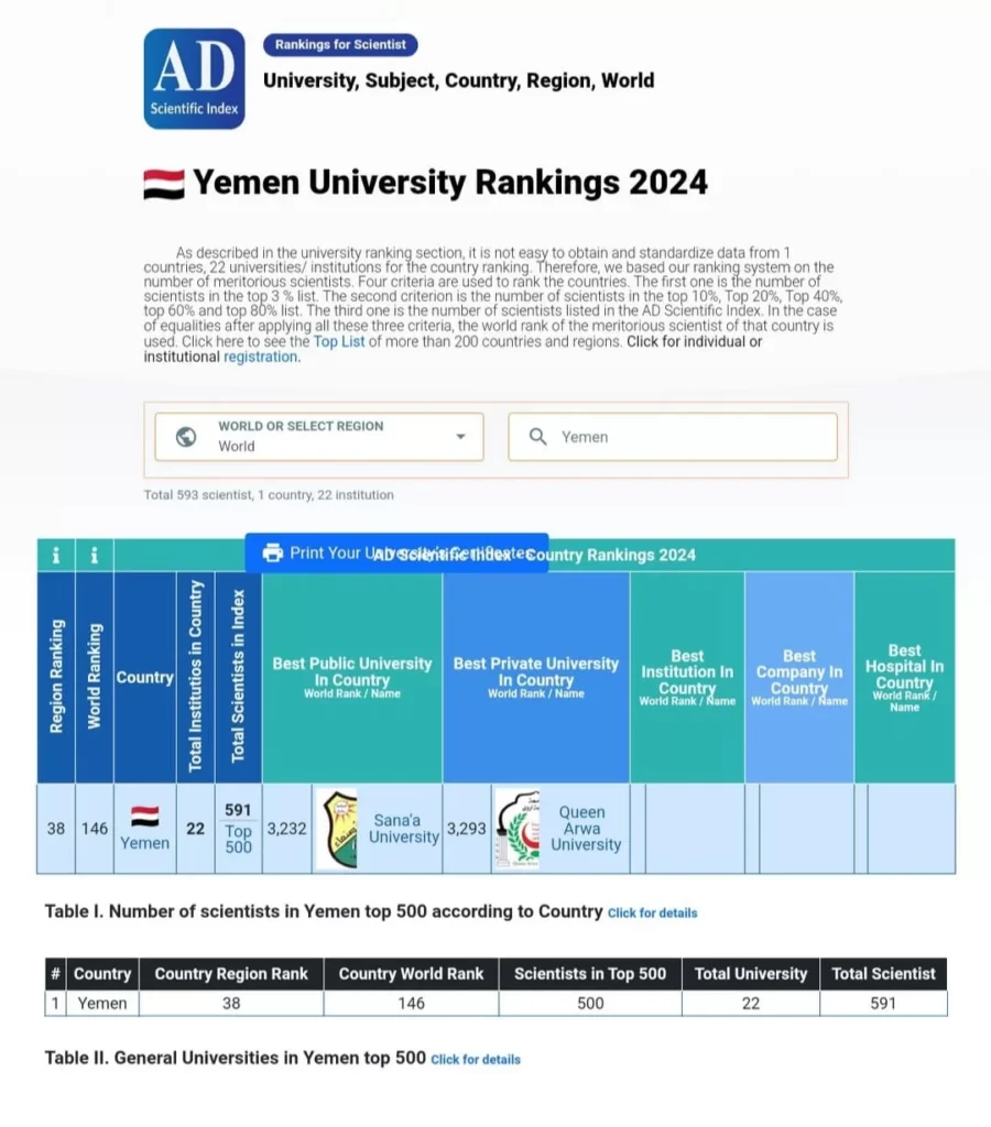 جامعة الملكة اروى في التصنيف الدولي للعلماء والباحثين AD Scientific Index اصدار 2024.